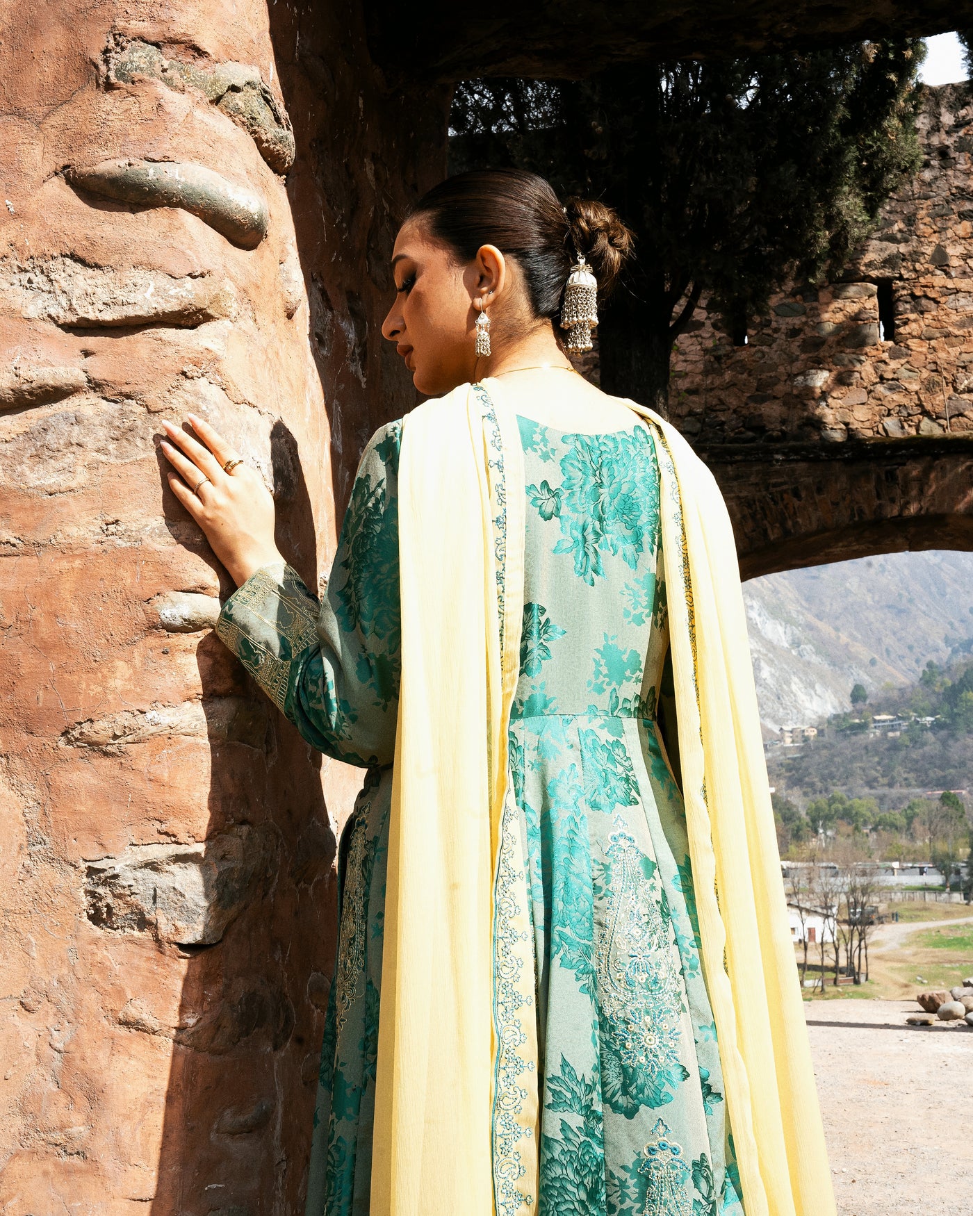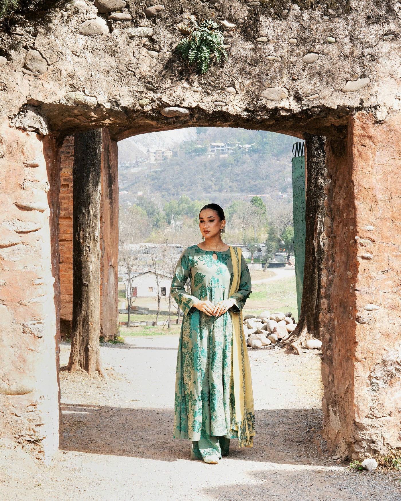Sophisticated and graceful, this dark cyan 3-piece suit is designed with elegant detailing and timeless appeal. The China Pati shirt features beautiful embroidery across the front and back, creating a rich and refined look. The Kashmiri embroidered sleeves further enhance the outfit, adding traditional artistry and delicate charm.