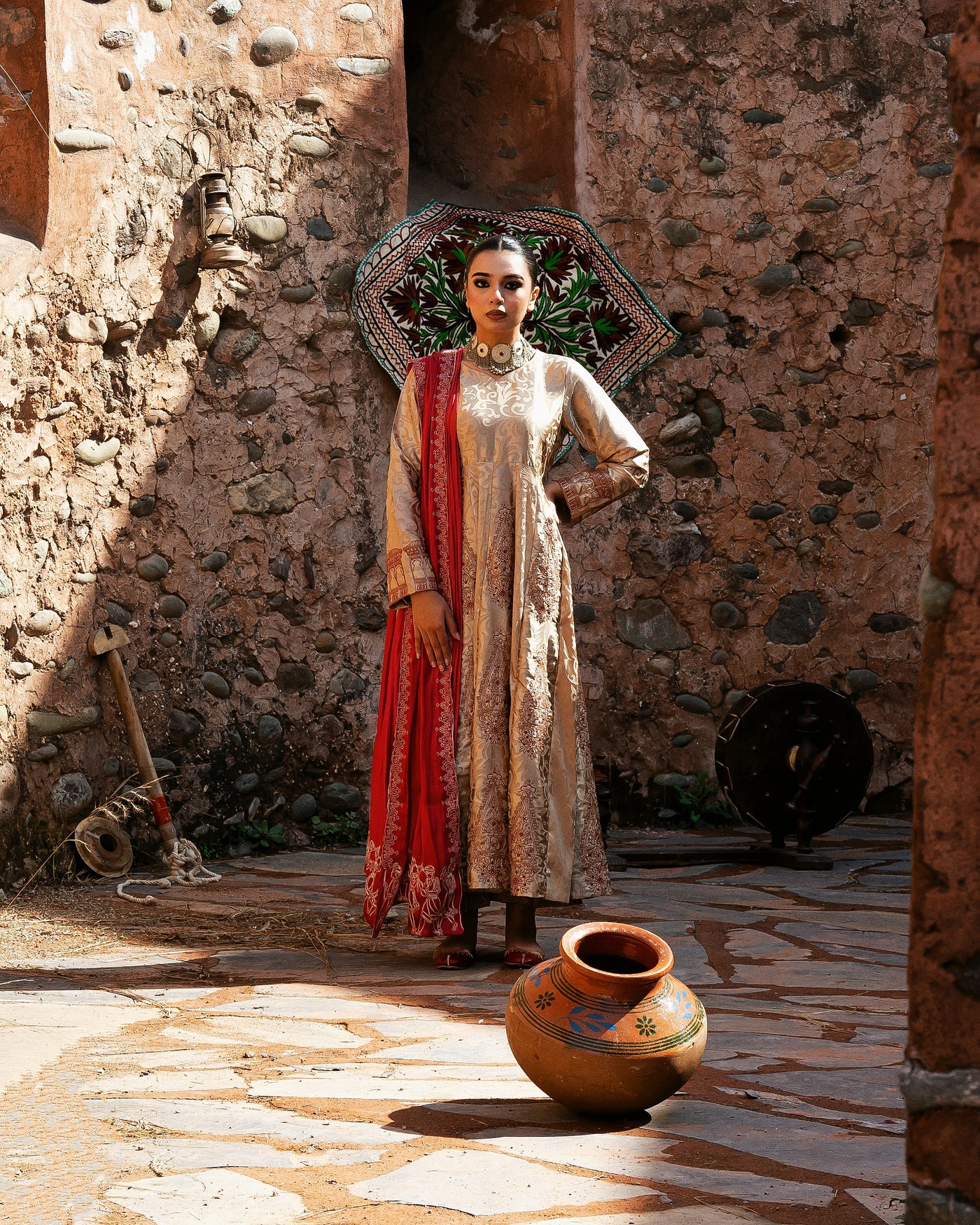 Paired with a luxurious raw silk trouser, the ensemble maintains a flattering and comfortable fit while exuding timeless sophistication. The striking red Sheesha Silk dupatta, embellished with delicate embroidery, completes the look with a bold yet graceful finishing touch.