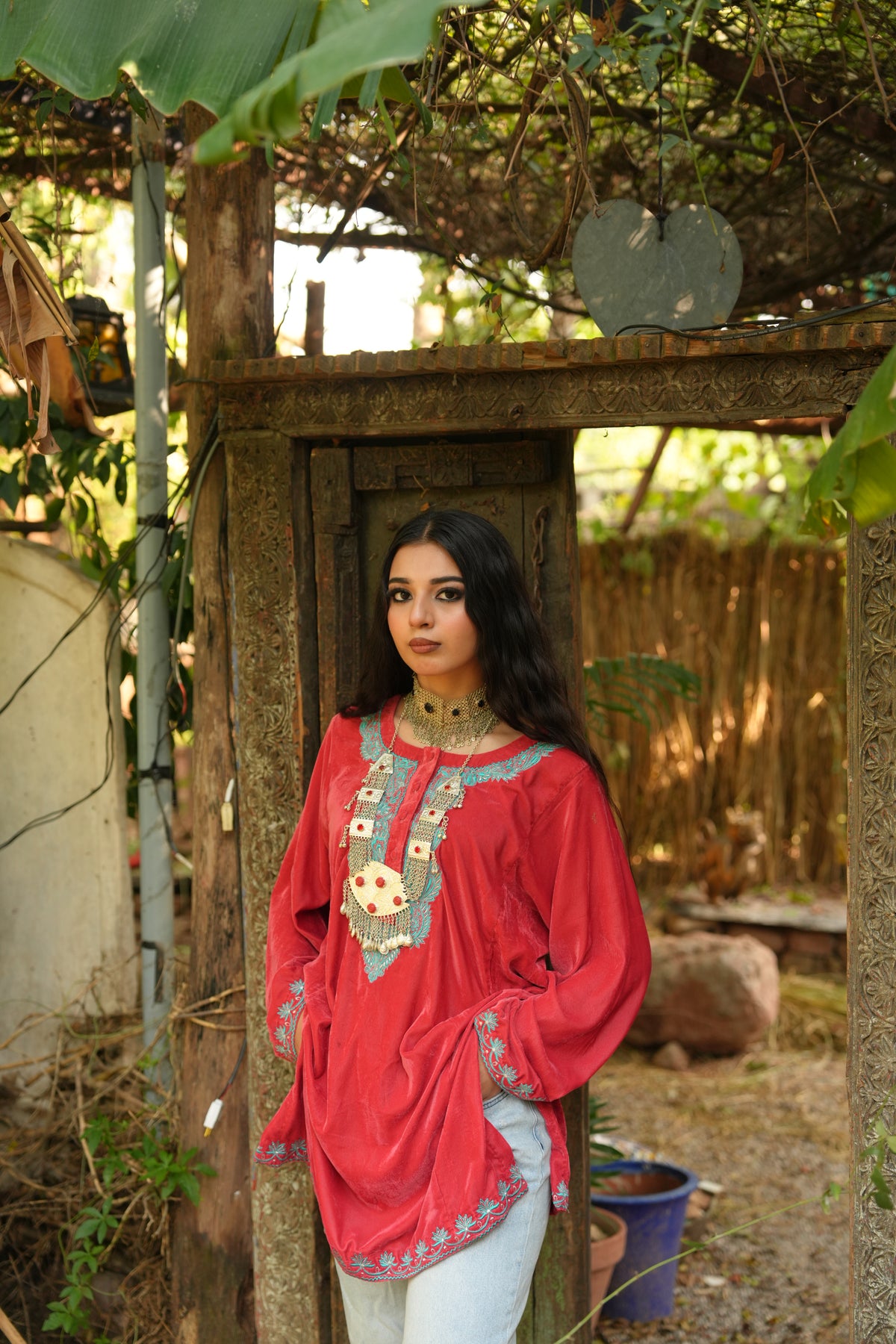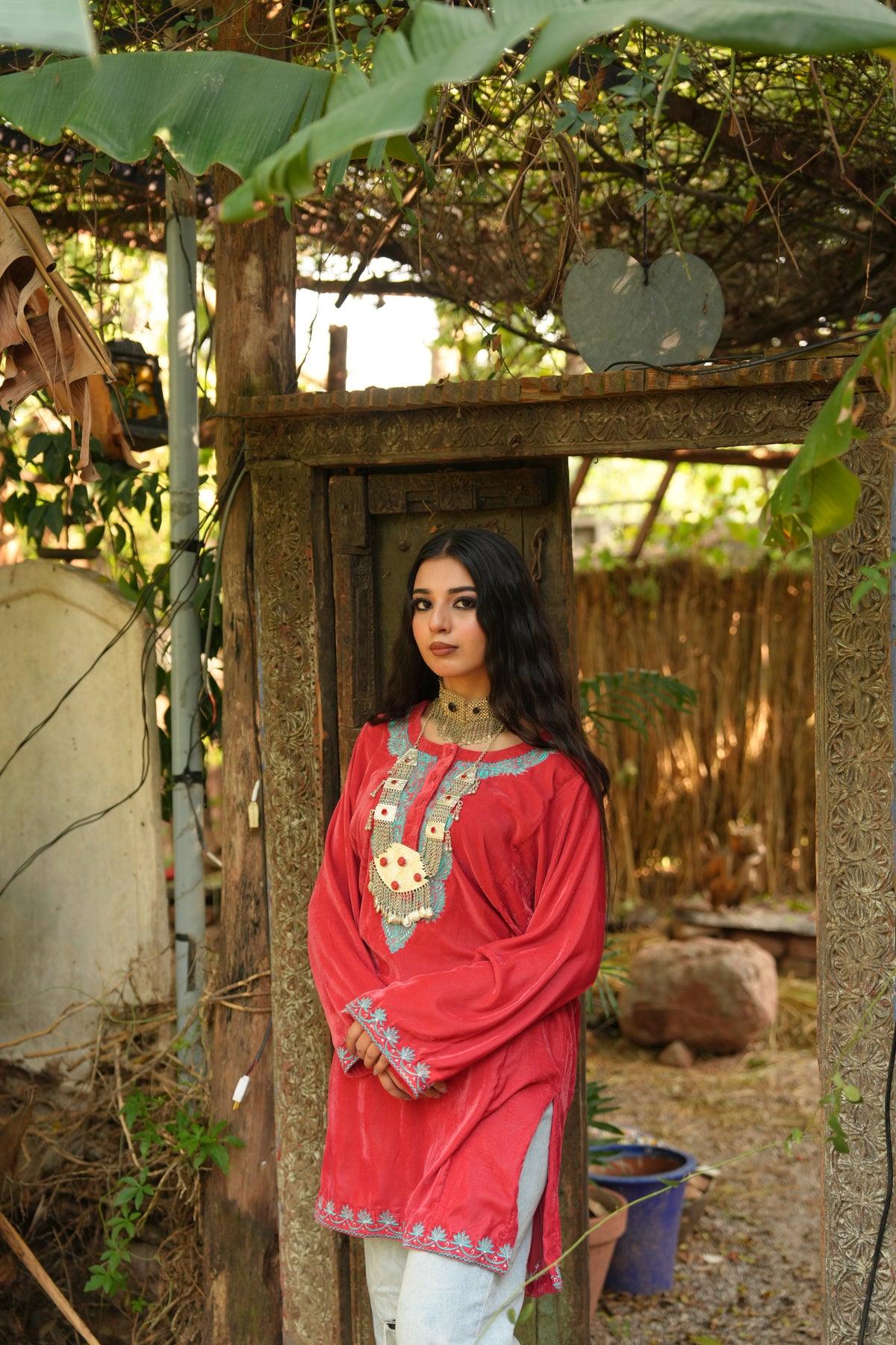 Experience traditional elegance with our Georgia Peach Velvet Charm – 1 Pc Embroidered Kashmiri Phiran. Crafted from luxurious velvet fabric, this outfit beautifully captures the essence of Kashmiri craftsmanship with a modern touch.